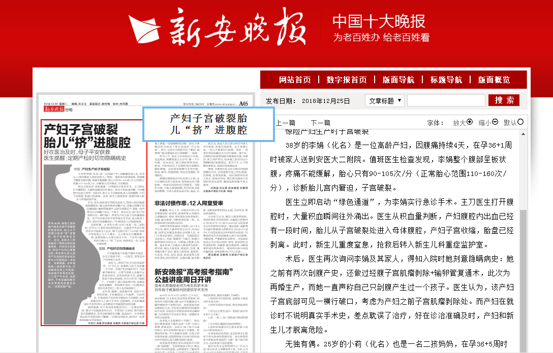 新安晚报:产妇子宫破裂胎儿“挤”进腹腔