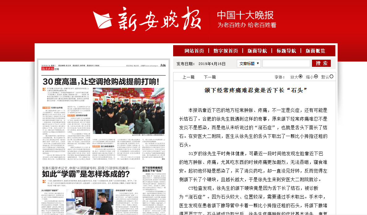 31岁的徐先生平时身体健康,可最近一段时间他发现左脸靠近下巴的地方肿胀、疼痛,尤其吃东西的时候疼痛更加剧烈,无法吞咽,寝食难安。起初他怀疑是感染了,买了消炎药吃,却一直没见好转,反而觉得左侧颌下长了个硬块,且越长越大,于是徐先生来到安医大二附院就诊。