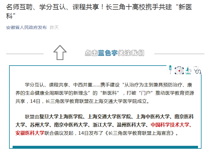 安徽省人民政府官方微信:名师互聘、学分互认、课程共享!长三角十高校携手共建“新医科”