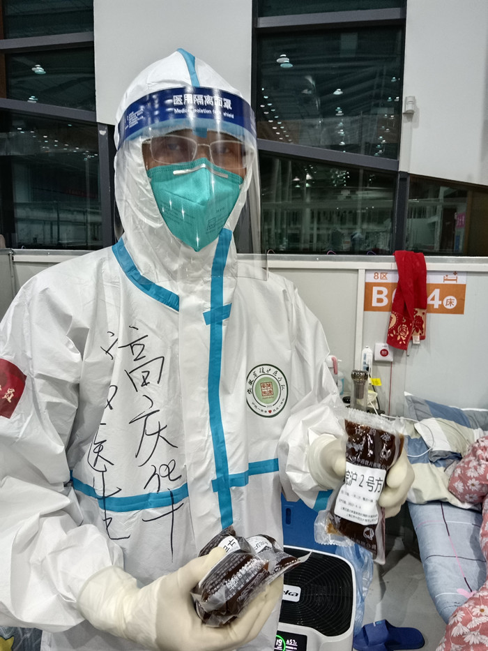 “等黎明时就发下去,患者早饭时就能喝上!”高庆华一刻也没有休息,调取出每位患者的入舱信息,逐一仔细检查患者有无基础疾病,有无禁忌证。待600多位患者的信息核对完毕后已接近凌晨5点。医疗队员手持患者信息登记表,开始一床一床按照之前核对的患者相关症状,发放相应的中药汤剂,并详细告知患者服用方法。所有中药分发完毕,已接近清晨8点。