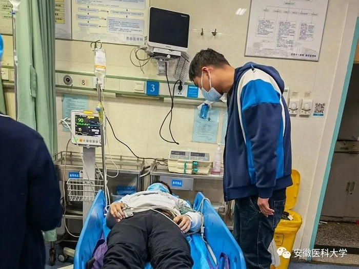 在我校第一附属医院急诊室里,刘埝挂号缴费、拿药,协助医生为学生抽血、拍CT、挂水,为学生喂药、安抚情绪,并和其父母沟通病情,一刻不曾停歇。经过抢救,张同学逐渐恢复清醒意识。待其康复回校后,刘埝持续关心关爱该生,坚持每两天晚查寝前去探望,掌握学生健康状态,提醒他按时吃药,规律作息,适当运动,保持良好的心态学习生活。