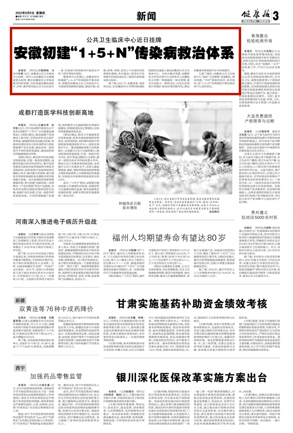 随着该中心的建立,安徽省初步构建起“1﹢5﹢N”传染病医疗救治体系,即建设安徽省公共卫生临床中心为省级传染病救治基地,建设合肥、芜湖、蚌埠、阜阳、安庆5个区域性传染病救治基地,各市建设1家高水平传染病专科医院或依托三级综合医院建设独立院区。