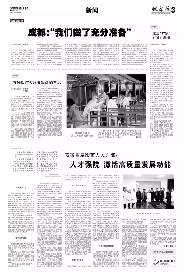 医院先后出台《阜阳市人民医院高层次人才引进实施办法(2021—2025年)》《阜阳市人民医院分层次人才培养实施方案》,持续加大对高层次、高学历人员的引进、培养、使用力度。
