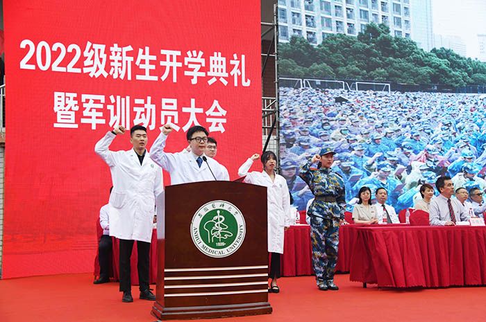 该校生物医学工程学院副教授杨润怀携新老生代表,带领2022级全体新生进行医学生入学宣誓。(查玮 程焱)