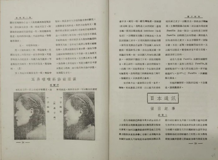 作为一本医学院校校友会刊,学术探讨及经验交流必不可少。在《校声》中就随处可见这样的文章。例如第五期中殷木强教授的《黄癣与白癣》;第六期中校友张秉枢则以自己的亲身经历,以《面部的表情与临诊的关系》为题,探讨了作为一名医生在治疗时面部表情要“致诚,庄重”,“看病在医生方面是件职业,亦可以说医病是件艺术……浮华轻躁根本是不许可的。”第三期中的《耳鼻咽喉科诊余杂谈》则讲述了一个现在看来都比较先进的手术——“隆鼻术”,文中介绍了以前手术的弊端,而“改用注射paraffin(石蜡)方法,即以一定溶解度之固形石蜡,以特别之注射器械,将其注入于鞍鼻凹部之皮下”。这种手术不仅简单,而且效果显著,“不出一星期即能肿消而痊愈,且高低可以随意,使受术者毫不感受苦痛,而达美形之目的。”为了说明手术的效果,文中还特意配发了患者手术前后对比的照片。