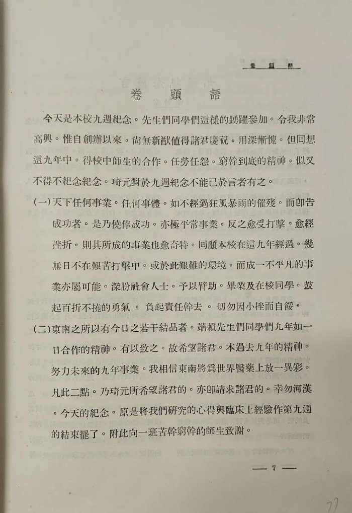 “东南之所以有今日之若干结晶者,端赖先生们同学们九年如一日合作的精神。故希望诸君本过去九年的精神,努力未来的九年事业,我相信东南将为世界医药上放一异彩。”诚如校长郭琦元在卷首语中所说,东南医学院的领导及校友也纷纷为母校“九岁生日”送上祝福,畅谈感想。“粤稽医术,肇自岐黄,上穷下际,民乃安康……救苦救难,乃捣膏肓,杏林春暖,杏坛流芳……”“对于以往的一切,可称认为满意;对于现在的种种,也好说足以自慰。然而对于将来呢?我们又要怎样地准备,怎样地冲锋,怎样地努力,怎样地前进。我们要明了我们的难关既不在于昔日,也不在于现在,我们的难关是在于将来啊……”