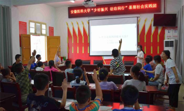 学校将普法宣传活动与大学生志愿服务活动以及暑期社会实践相结合,广大学子学以致用,是学习者,也是宣传员,更是扩大法治宣传教育覆盖面和影响力的践行者,让宪法及相关法律的知识内容以说得清、听得懂、学得会的方式走进基层人民群众。他们有的前往定远县法院、检察院开展以“与法同行、护佑成长”为主题的学习参观活动,见证基层司法机关在法治宣传中的工作成效。有的在暑期深入肥西县铭传乡等地开展专题调研和普法宣传,帮助当地小学生树立法律意识和安全意识,鼓励其做知法懂法守法的好少年。