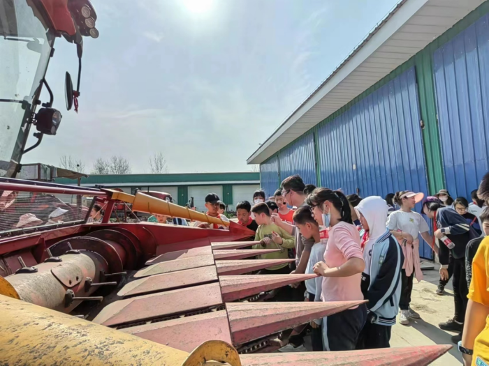 下午,同学们参观了农机装备库。现场基地辅导员向同学们展示了农药喷洒机、联合收割机、施肥机、各类拖拉机及耕具等大型农业装备。让同学们理解“农业的出路在于机械化”、“藏粮于技”含义。
