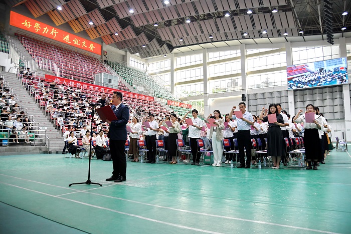 药学院孟晓明教授作为领誓代表,带领新入职教职工面向国旗进行庄严的入职宣誓。