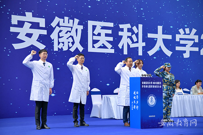 校公共卫生学院执行院长王华教授携新老生代表,带领2023级全体新生郑重诵读医学生誓词。