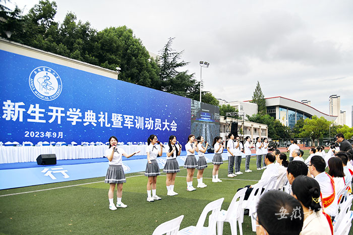 开学典礼前,校大学生良医合唱团演唱了《强国一代有我在》《我们都是追梦人》两首歌曲,为新同学献上祝福。