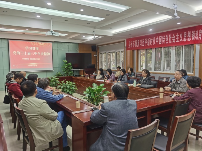 离退休教职工党委书记谢敏主持报告会,离退休教职工党委委员、各支部书记、支部委员及党员代表等近30人参加学习。(离退休教职工党委)