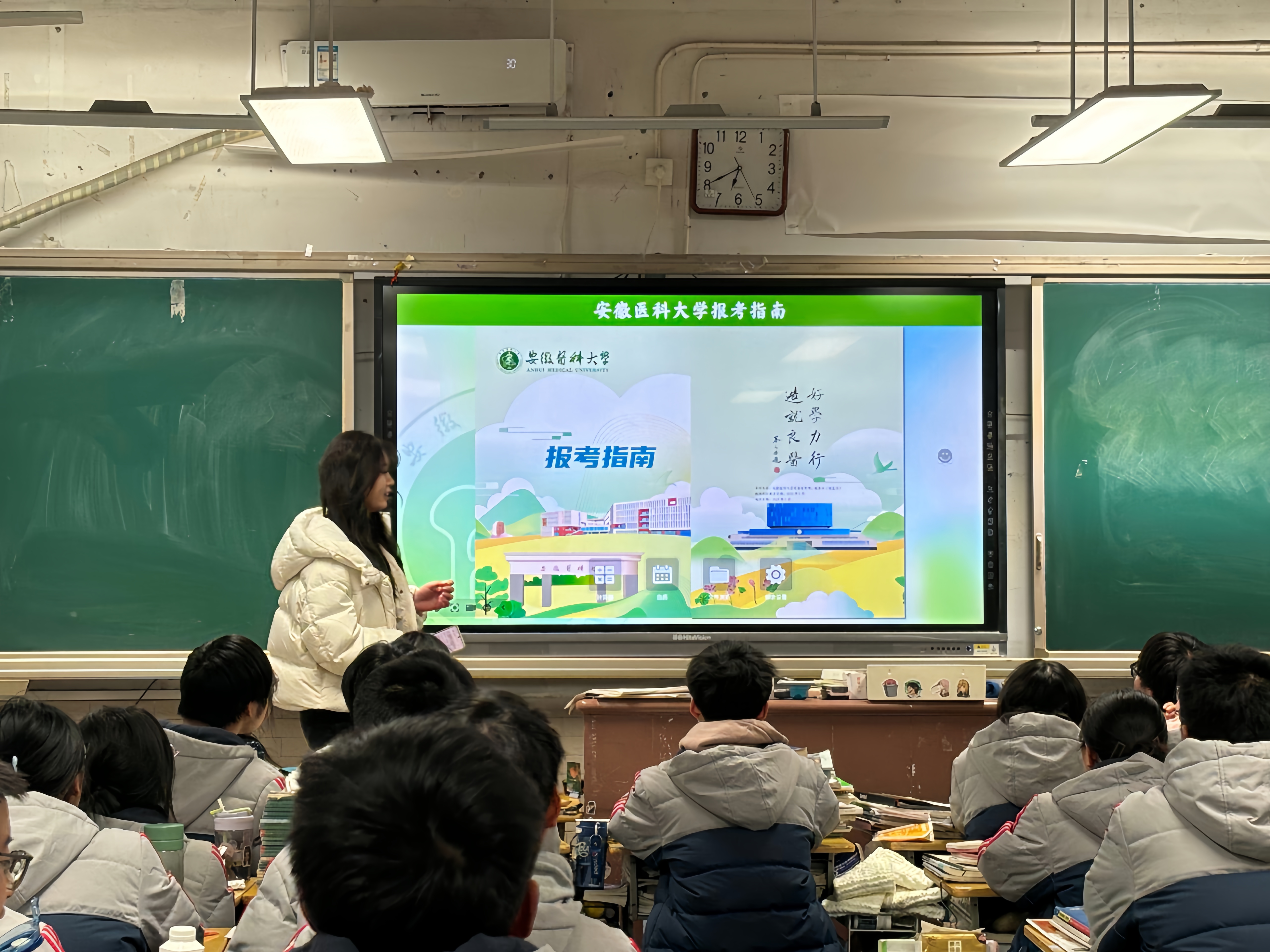 此外,我校还充分发挥学生的桥梁纽带作用,鼓励学子重返高中母校开展招生宣传,近700名学子积极参与。巢湖临床医学院2024级临床定向专业吴宇畅便是其中一员,他返回高中母校,向学弟学妹们展示我校的发展历程、教育理念、优势学科、科研成果以及大学校园的多彩生活,并结合自身的报考经验,帮助他们明晰未来专业选择的方向,增强了大家的学习热情。